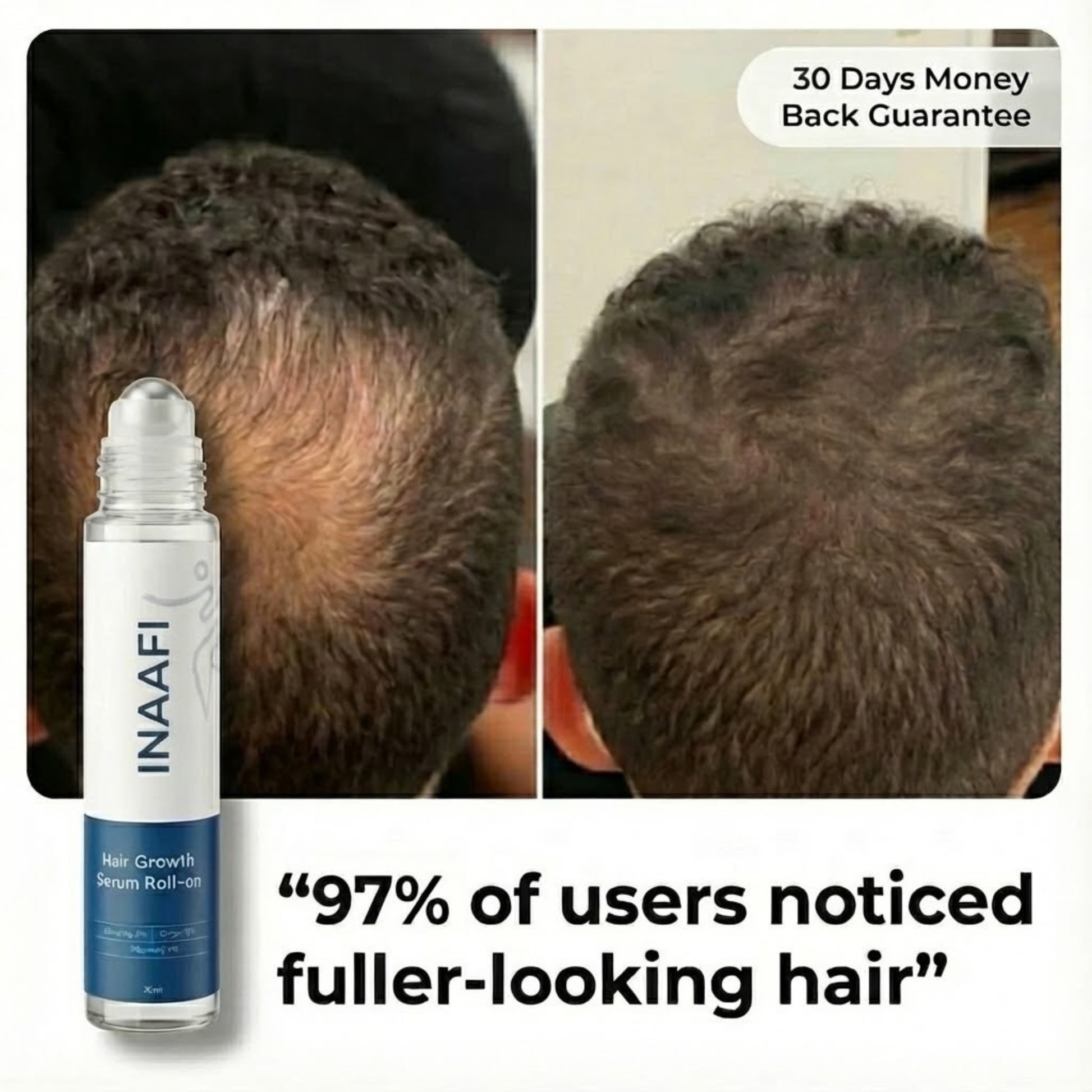 Try Inaafi hair serum risk-free for 30 full days. We want you to use the entire bottle. If you don't see new hair growth and reduced shedding, simply email us and we’ll refund every penny. Keep the bottle no returns necessary. We're confident you'll love your results.
